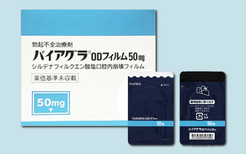 バイアグラODフィルムはバイアグラと同じシルデナフィルを有効成分とするフィルム型の口腔内崩壊フィルムです(発売元はヴィアトリス製薬)。